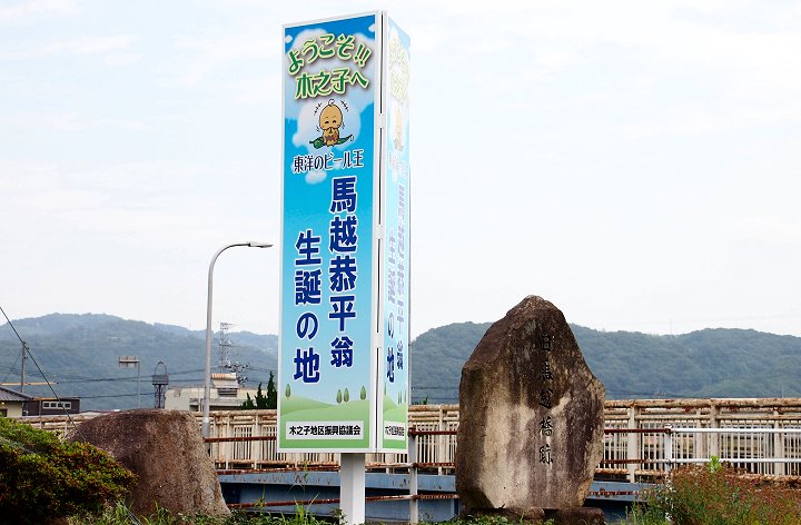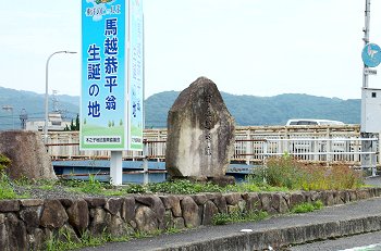 馬越橋跡には『旧馬越橋跡』と刻まれました石碑が…その後方に、現在使用しています「(新)馬越橋」が…石碑に隣接し、『馬越恭平翁 生誕の地(木之子地区振興協議会)』の看板も設置されてありました(^.-)☆