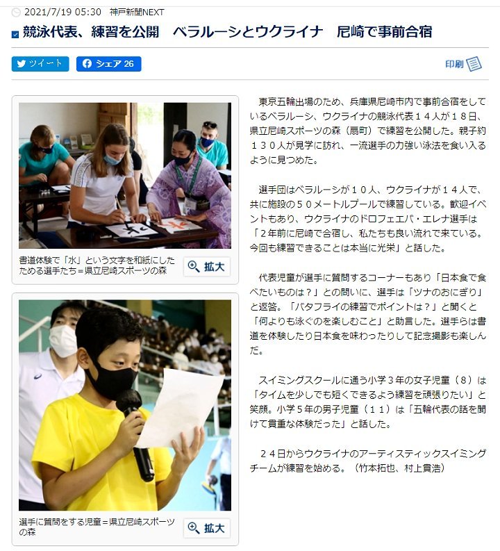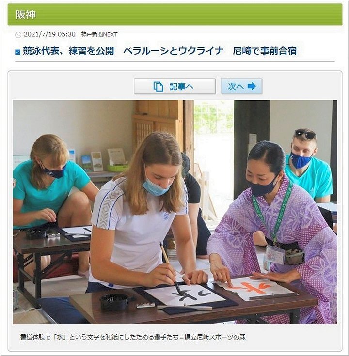 選手団はベラルーシが10人、ウクライナが14人で、共に施設の50メートルプールで練習している。歓迎イベントもあり、ウクライナのドロフェエバ・エレナ選手は「2年前に尼崎で合宿し、私たちも良い流れで来ている。今回も練習できることは本当に光栄」と話した。
