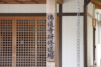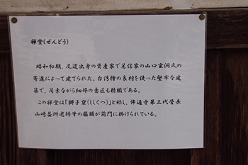 この禅堂は「獅子窟(ししくつ)」と称し、佛通寺第三代管長山崎益洲老師筆の扁額が前門に掛けられている。