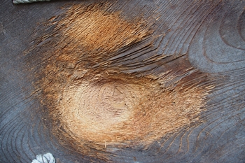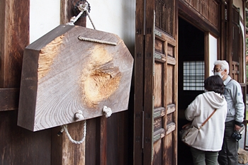研修道場入口には、使いこなされた年期を感じさせます「板木」が…大概、右手で打ちますから右半分が窪んでおりますネ(^.-)☆