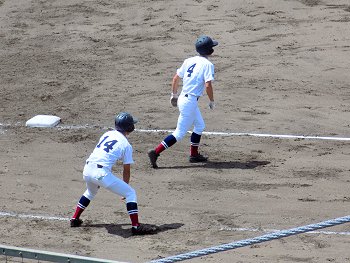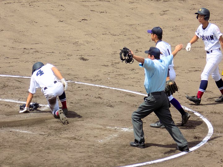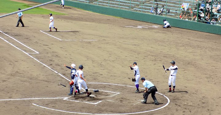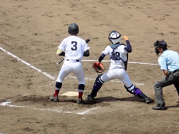 1回表の明王台の攻撃は、無得点。その裏の盈進高校の攻撃では、次から次に得点が。まだノーアウトなんですけど、既に4得点。