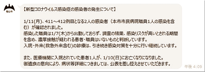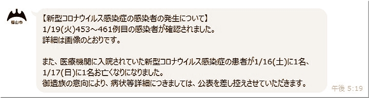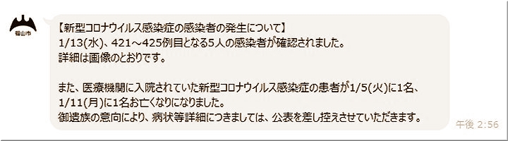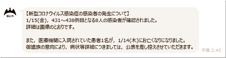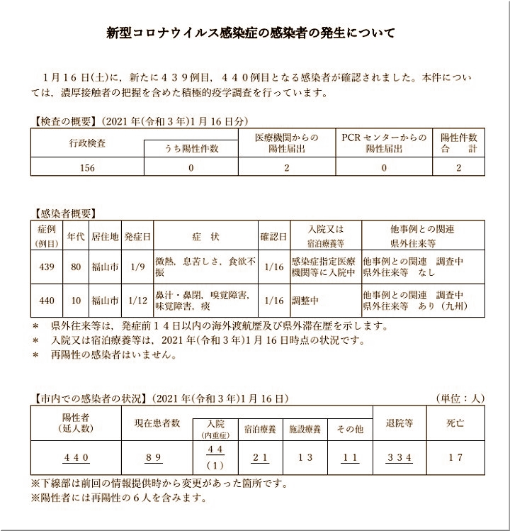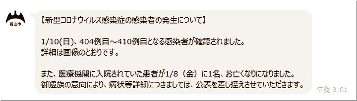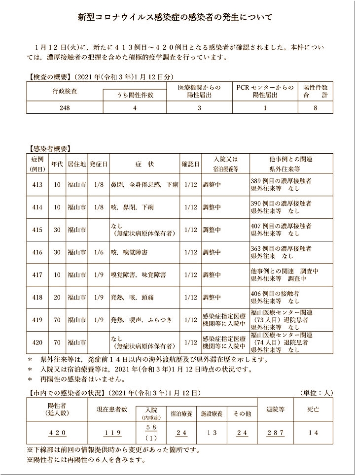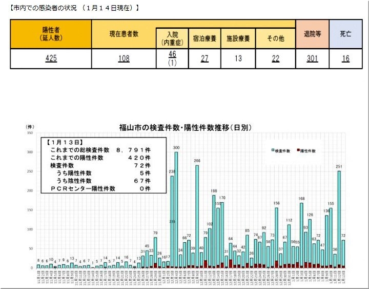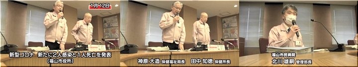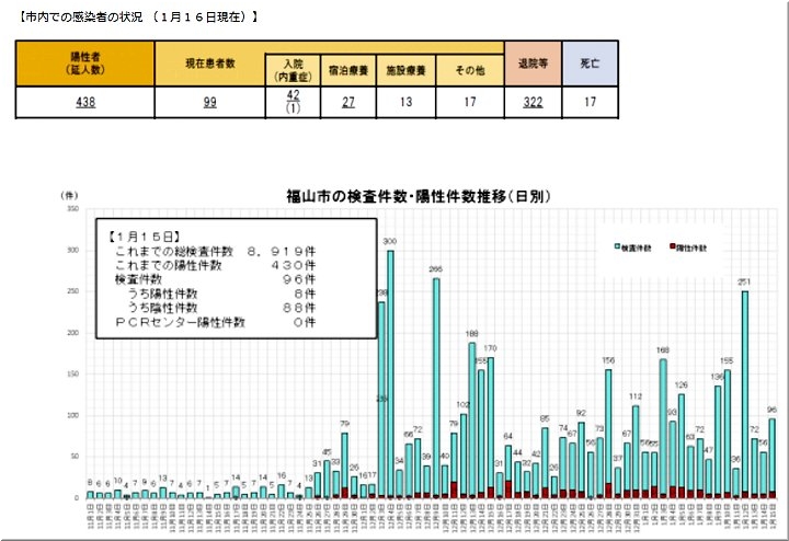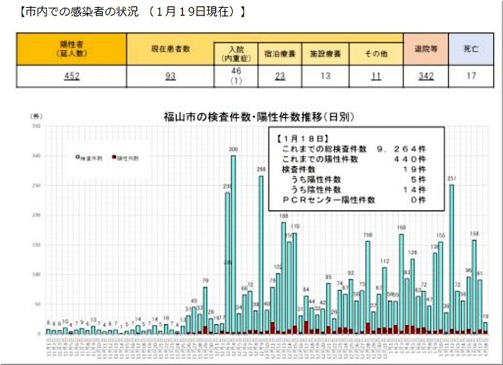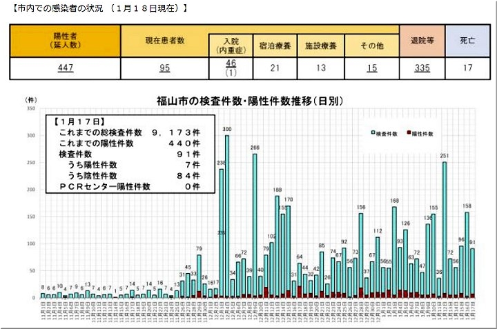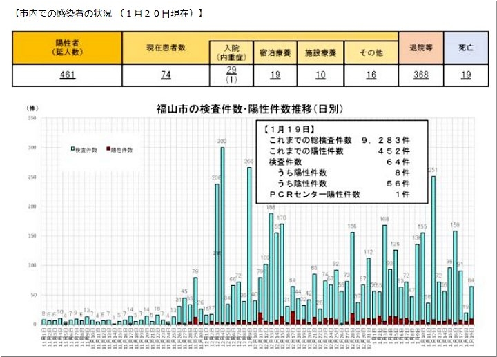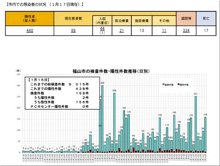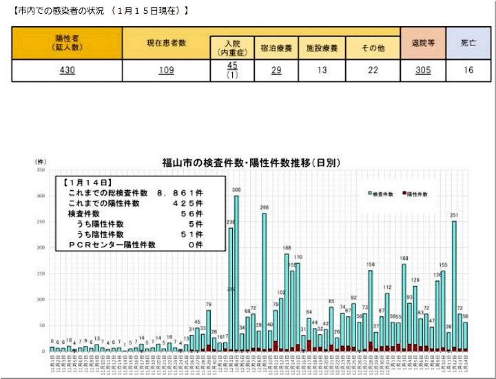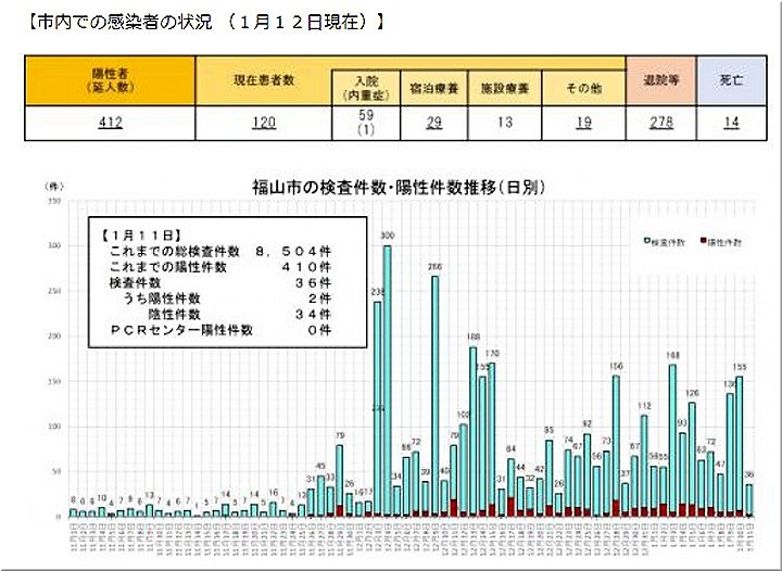 昨日(1/12)の福山市では、コロナ感染者が2名の確認のようです…