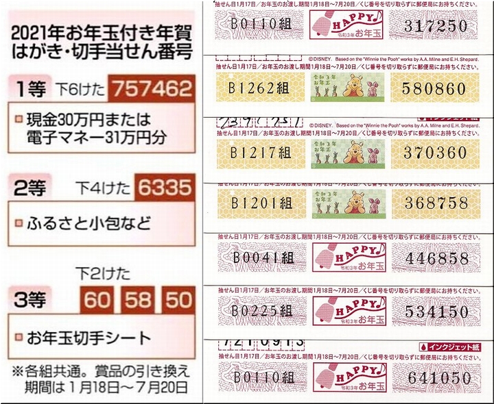 今朝の朝刊に「2021年お年玉付き年賀ハガキ・切手当選番号」の発表が…