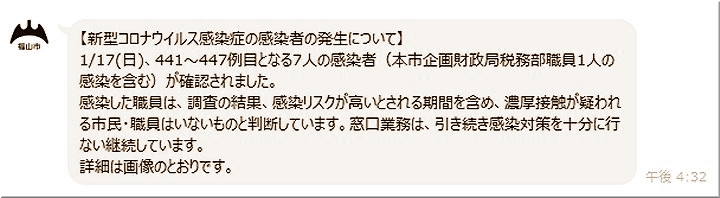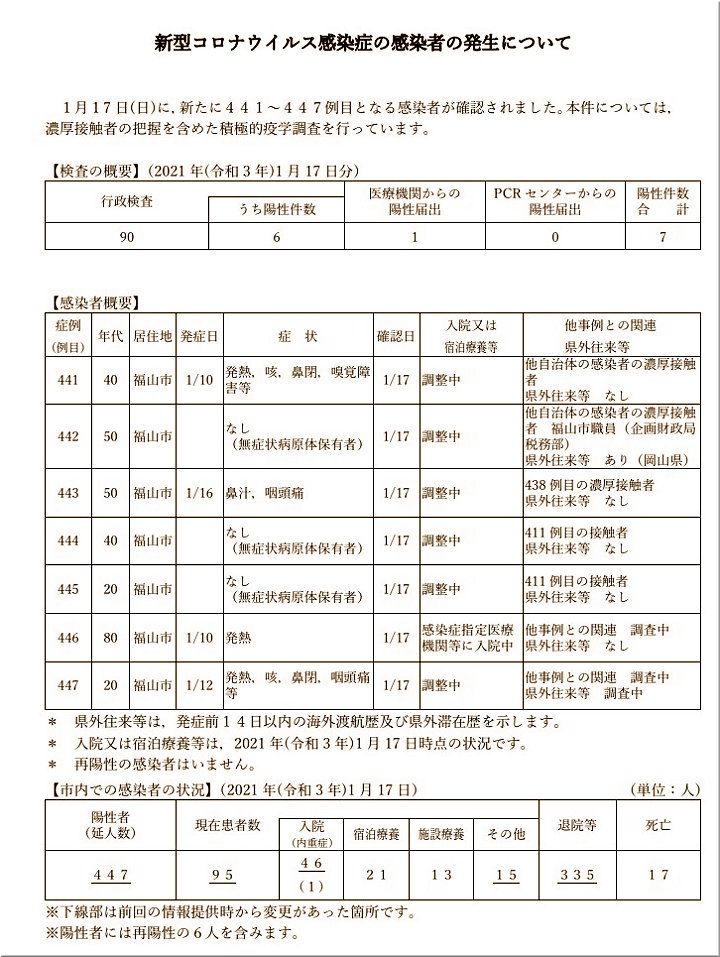 1/17(日)、441〜447例目となる7人の感染者(本市企画財政局税務部職員1人の感染を含む)が確認されました。