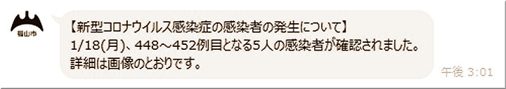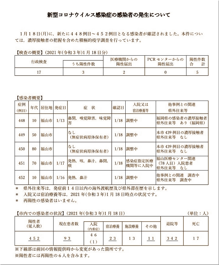 1/18(月)、448〜452例目となる5人の感染者が確認されました。