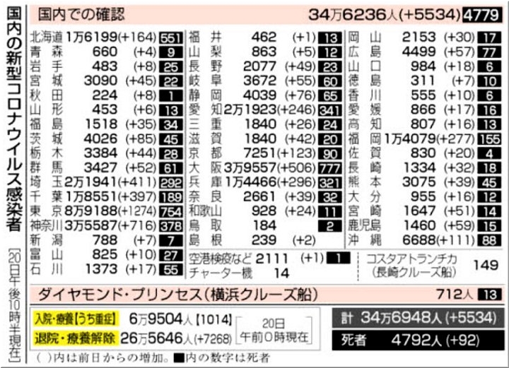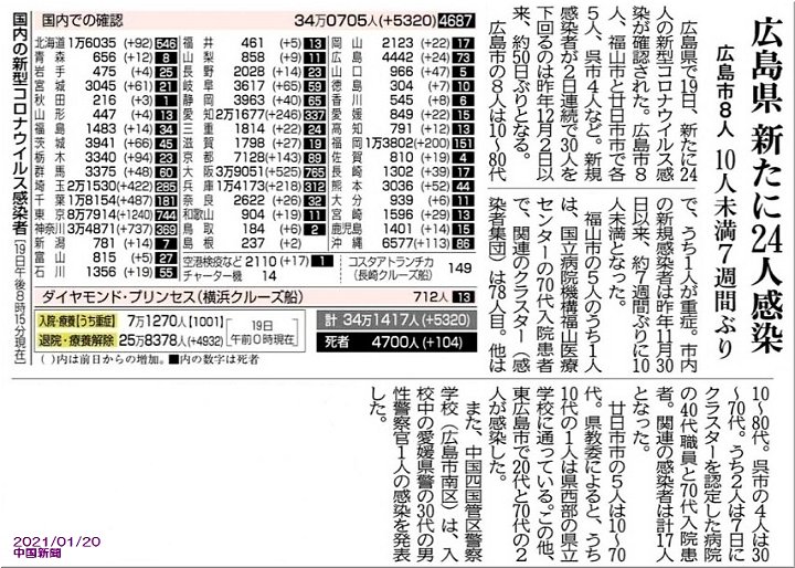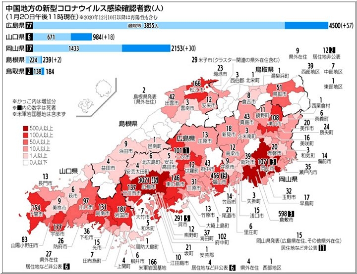 ◆広島県で57人感染、4人死亡 20日の新型コロナ、広島市は39人に急増