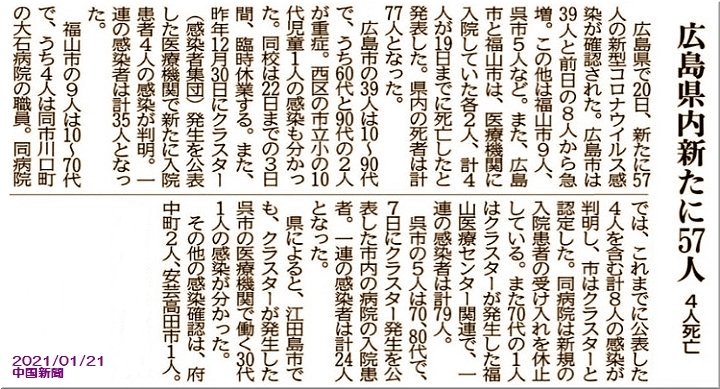 広島県で20日、新たに57人の新型コロナウイルス感染が確認された。広島市は39人と前日の8人から急増。この他は福山市9人、呉市5人など。また、広島市と福山市は、医療機関に入院していた各2人、計4人が19日までに死亡したと発表した。県内の死者は計77人となった。