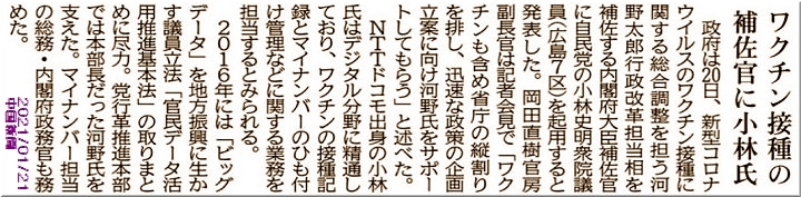 ところで、今朝の中国新聞sanの記事に『ワクチン摂取の補佐官に小林氏』と、広島7区選出の小林史明代議士の話題が…
