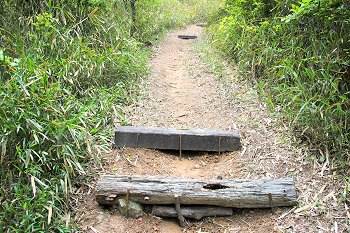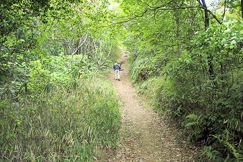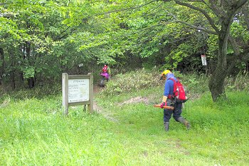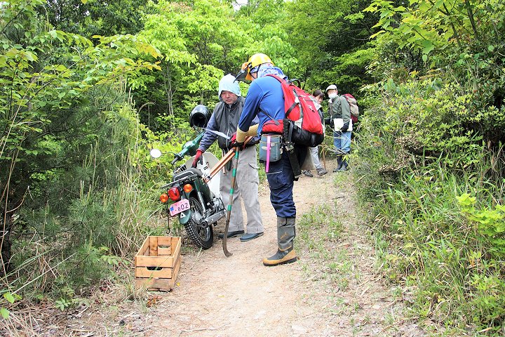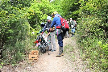 暫く上がって行きましたら、4名の内のヘルメット被った方が、バイクで登山道に入り何やら作業していた方と図面片手に会話中でありました。