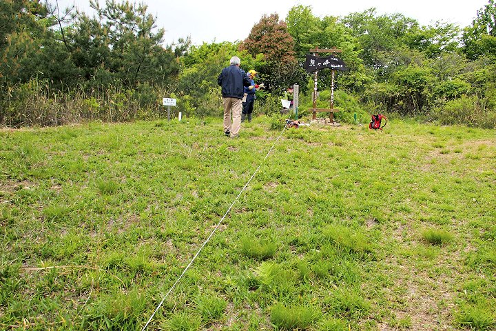 熊ヶ峰山頂南側の山道を少し下った所に「境界見出標27」の標識がありまして、この地点から、山頂の「沼南アルプス最高峰 熊ヶ峰」の石柱脇の岩までロープを…そして、また、図面を手に打合せです。
