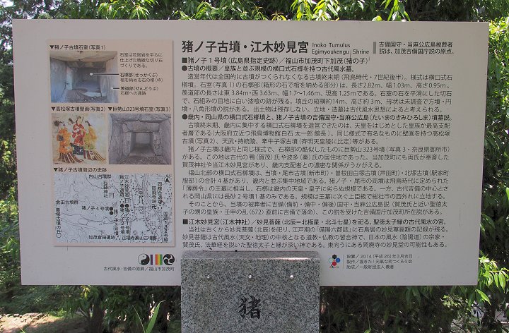 境内の左側には、「福山古墳ロード案内板」「猪ノ子古墳・江木妙見宮案内板」「ミレニアムカプセル」「手水石」「猪ノ子古墳説明板」が設置されていますので、順番に眼を通してみます。