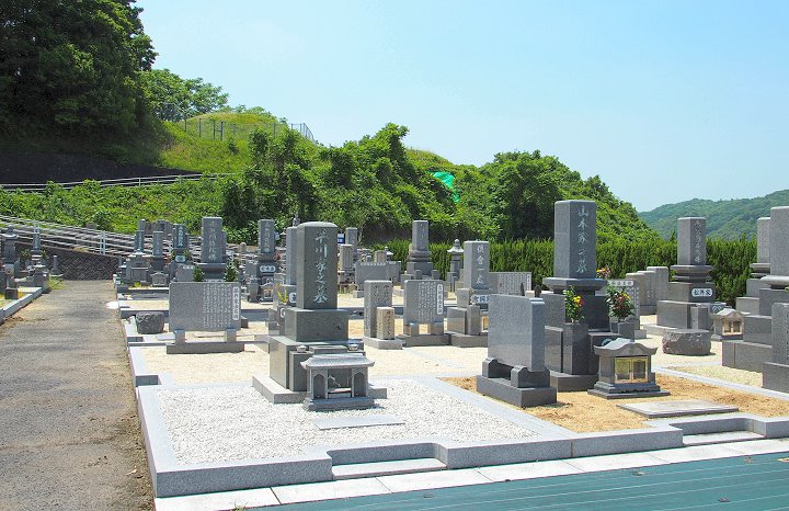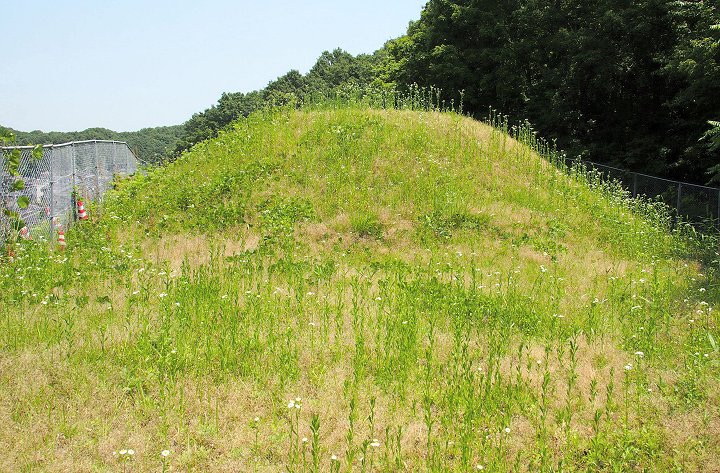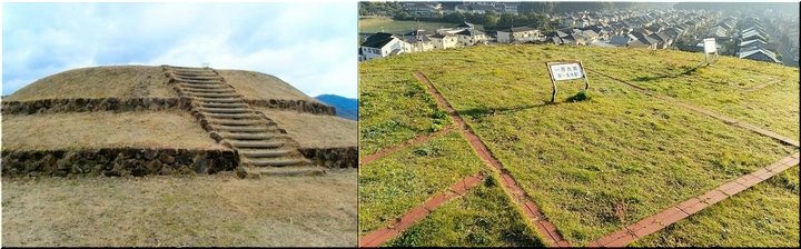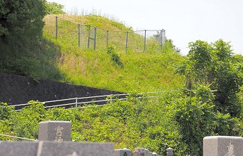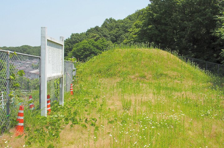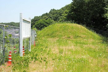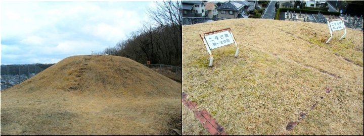 丘陵西端に位置する第一号古墳は、直径20m、高さ3mで、丘陵の裾には20〜30cm角の平石が貼り付けられています。