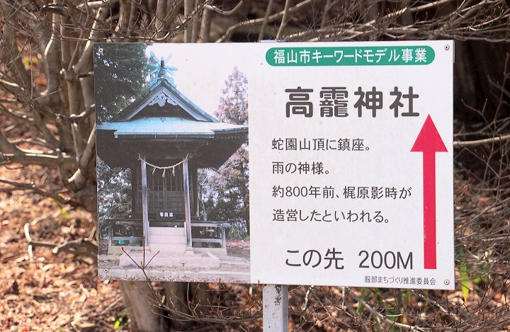 蛇円山頂に鎮座。雨の神様。約800年前、梶原影時が造営したといわれる。 この先 200M ↑ --- 服部まちづくり推進委員会 ---