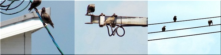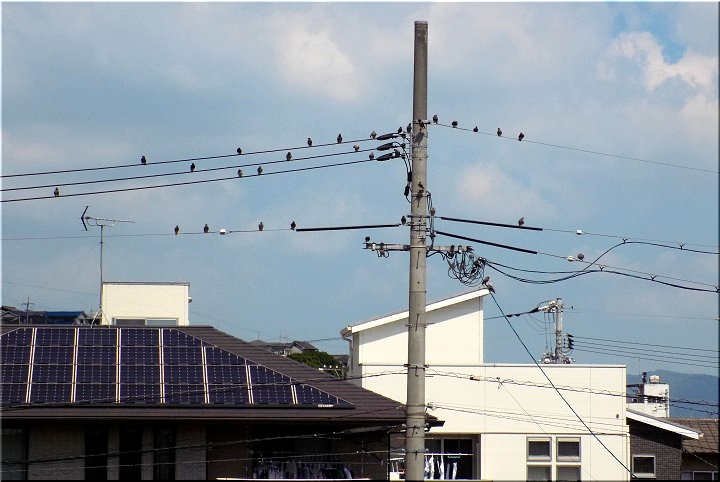 触ってみますと全く動きませんので、刈草の山の上に置いておきました。そして、暑いなぁ〜と周辺を見廻しますと、鳥の大群が飛来して来まして、前方の電線で一休み。
