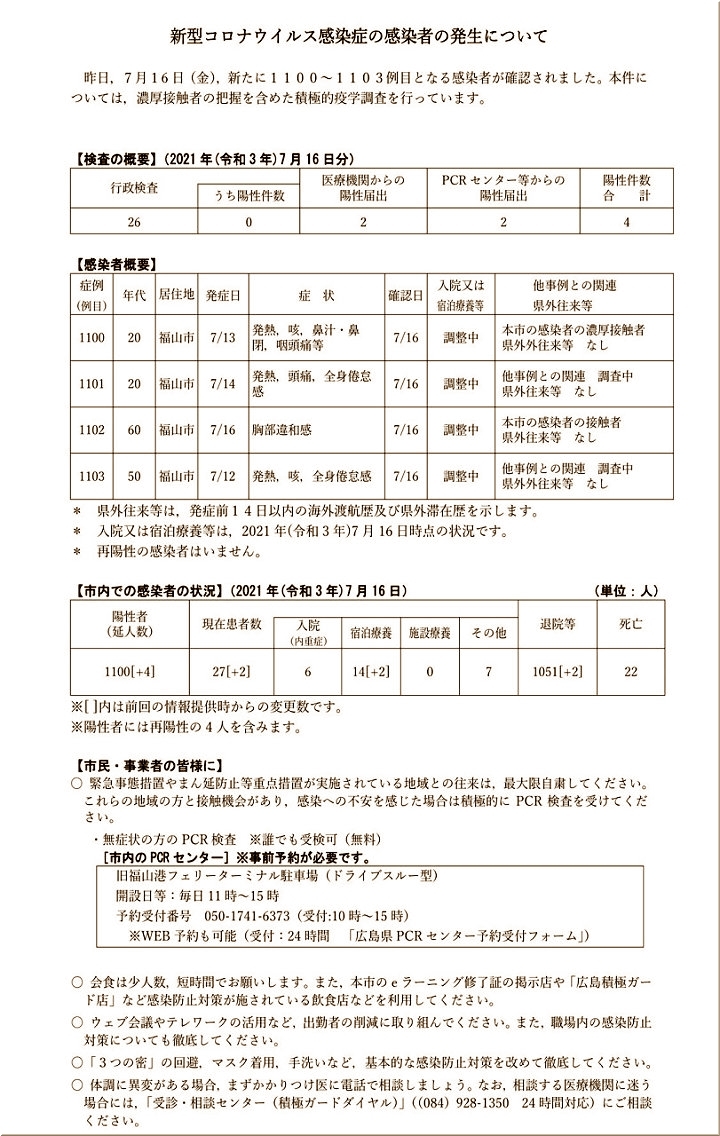 7/16日(金)、1100〜1103例目となる4人の感染者が確認されました。詳細は画像のとおりです。