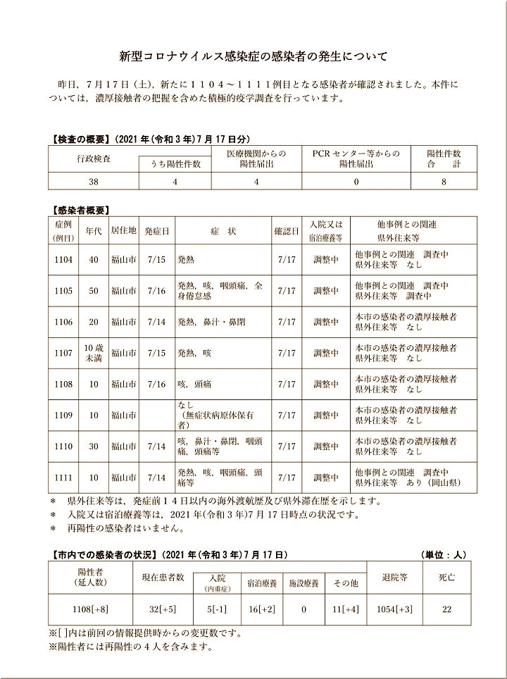 7/17(土)、1104〜1111例目となる8人の感染者が確認されました。詳細は画像のとおりです。