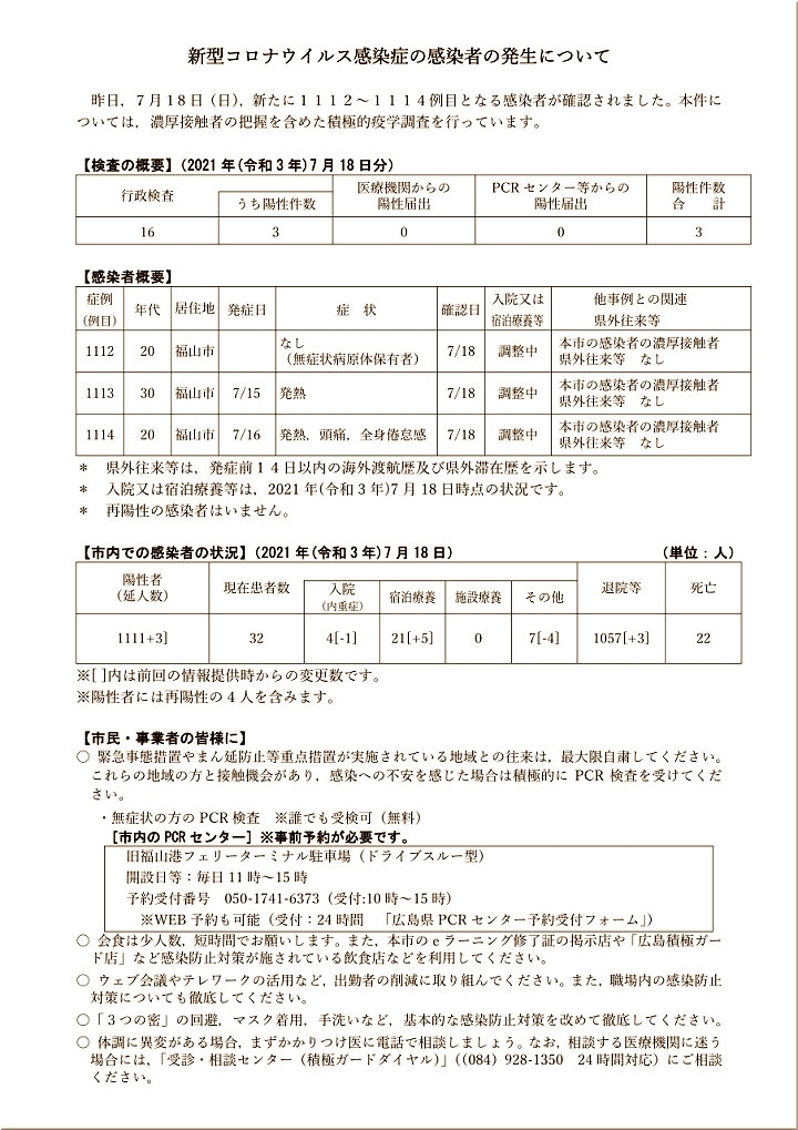 7/18(日)、1112〜1114例目となる3人の感染者が確認されました。詳細は画像のとおりです。