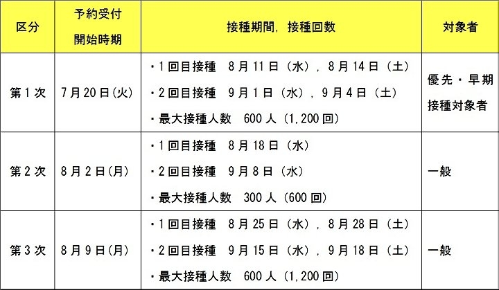 日中働く人が円滑に接種できるよう、集団接種会場(エフピコアリーナふくやま)に新たに夜間接種枠(19〜21時)を設けます。7/20(火)からは優先・早期接種対象者、8/2(月)からは一般の方の予約受付を開始します。詳細は画像のとおりです。