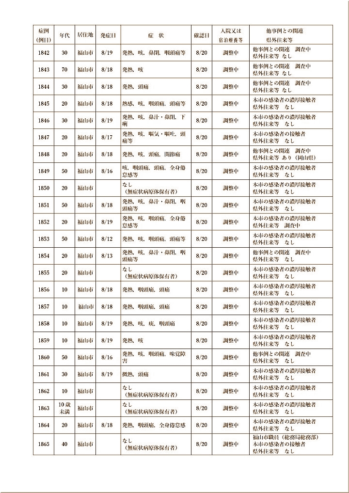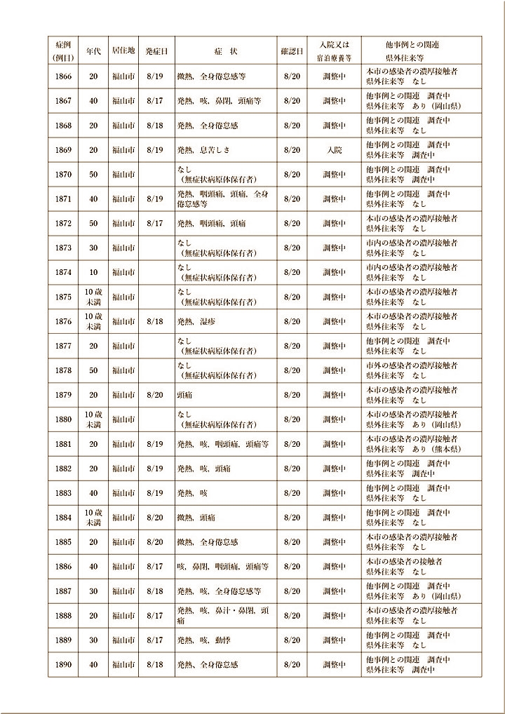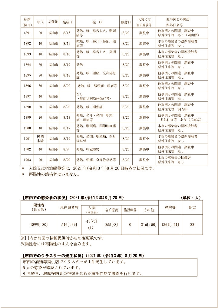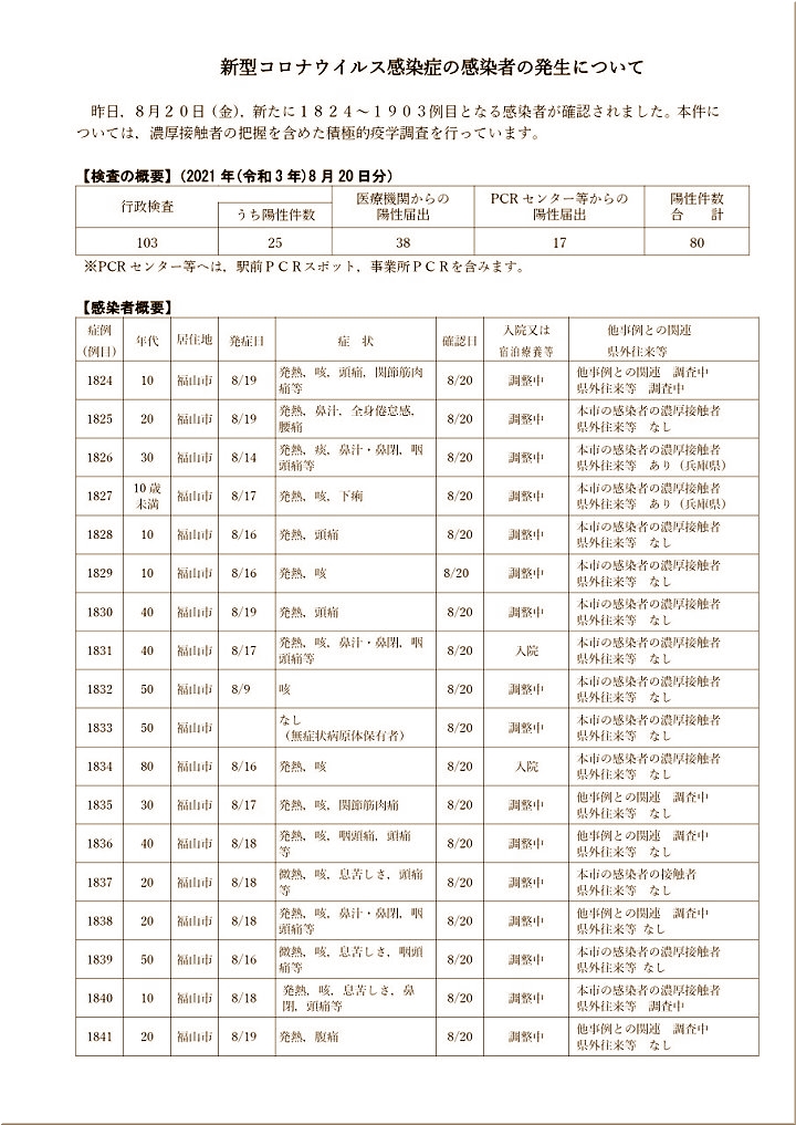 8/20(金)、1824〜1903例目となる80人の感染者が確認されました。