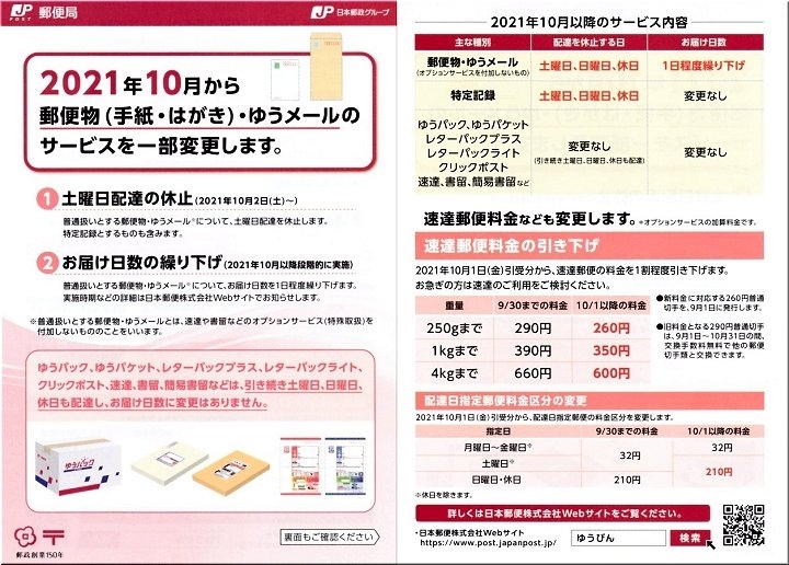 本日の午前中、郵便受けを覗きますと、郵便物と一緒にこんなチラシが入っておりました。んっ!?…また郵便料金の値上げ!?…と、よくよく見てみますと、10月から郵便物のサービスの一部変更のご案内でありました(^.-)☆