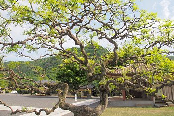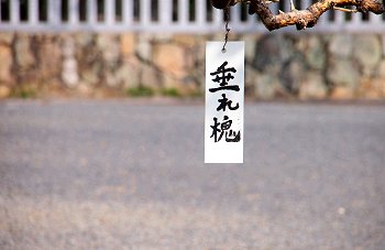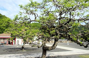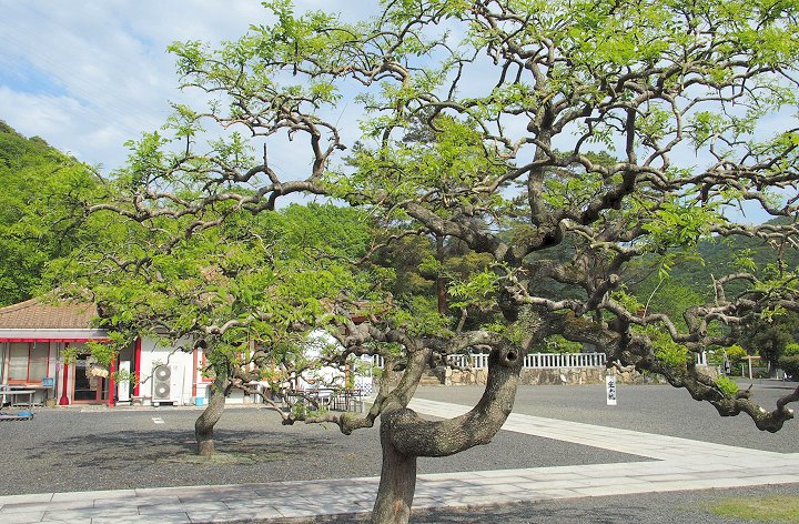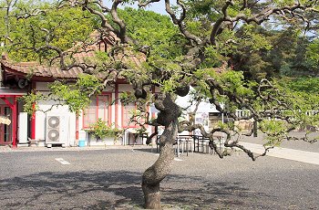 藤棚と「館址亭」の間には、実に立派な樹木が…この樹木には「垂れ槐(シダレエンジュ)」の説明書きが。「垂れ槐」の後方の建物が「館址亭」です。