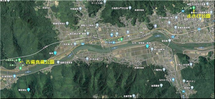 仕方なく自販機で缶コーヒーを啜りながら一服しておりますと、店の方なのでしょうか…何処からか戻られました女性が店内に入ろうとしておられます。で、急いで近付き「この吉備真備公園は、昔と随分変わりましたネ。昔は池があったように思うのですけど…」と、声を掛けますと、「あぁ、皆さん、よく間違えられますのですよ。それは此処ではなくて、もぅ少し5kmばかり総社市方向に行きましたら有りますけど、それは『まきび公園』ですよ(^-^)」と笑いながら(^.-)☆