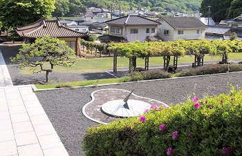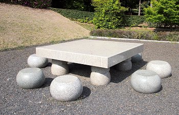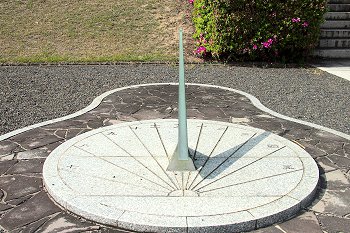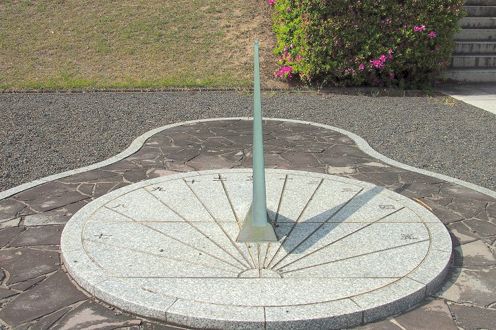 像の一段下には「日時計」と「石碁盤」が。吉備公が中国から伝えたとされる囲碁にちなんだ石造りの大碁盤ですネ。日時計も吉備公が中国から伝えたのかも…この画像を撮りますのと同時に時刻を確認しますと、P.M.03:15。当然の事なのでしょうけど、合っておりました(^-^)//"