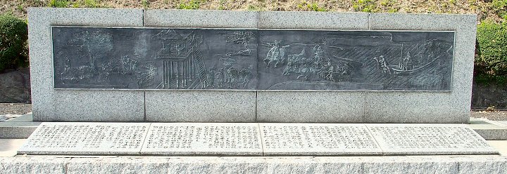 吉備真備公銅像に上がりますと、此処には、像の右側に「吉備大臣入唐絵詞」「絵巻石屏風」が…
