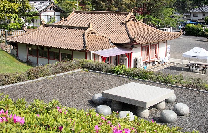 中国家屋を再現した館址亭では手打ちうどんを販売し、観光客らの人気を集めている。