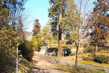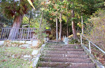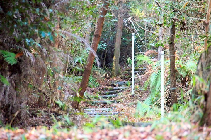 この「神楽舎」前の脇参道を挟み山側には、こんな遊歩道が上に向かって続いています。社殿配置略図にも「遊歩道」として記載。