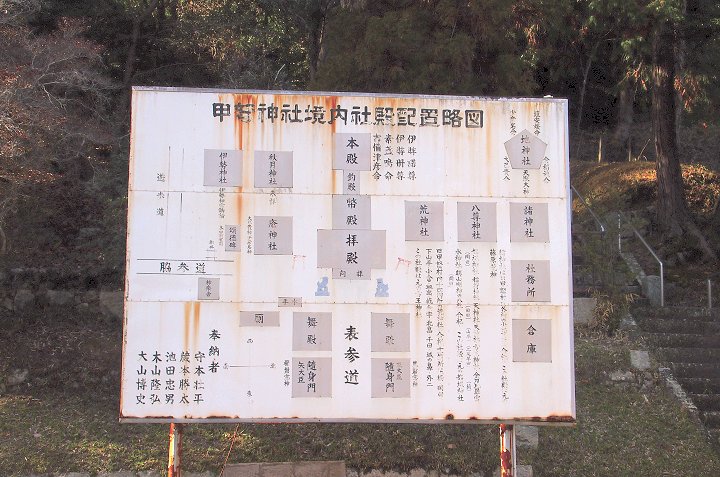 境内を見廻してみますと、甲弩神社拝殿の左側には鳥居がありまして、その左に「甲弩神社境内社殿配置略図」が設けられています。これを拝見しますと各社殿がよく分かります。