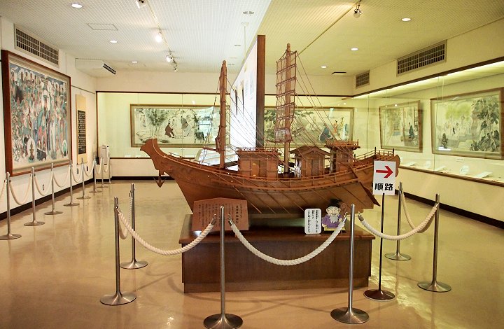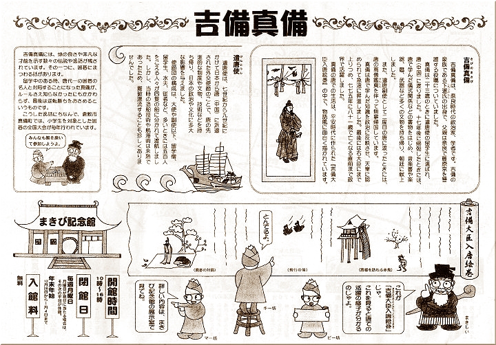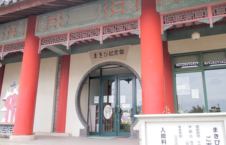 まきび公園内にあり、朱塗りの柱が中国情緒を醸し出しています。遣唐副使として中国に留学した際、儒教・歴史・天文学・音楽などの学問を修め、帰国後は奈良時代の朝廷で活躍した吉備真備公に関する資料を数多く展示しています。