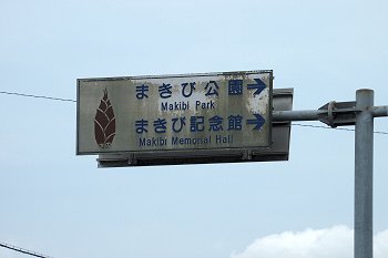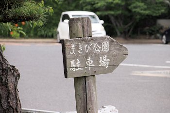 気が付きますと、頭上には『まきび公園・まきび記念館 ⇒』の案内板。この下から「まきび公園駐車場」にと入ります。平日ですから、訪れておられます方は少なそうでありました(^-^)