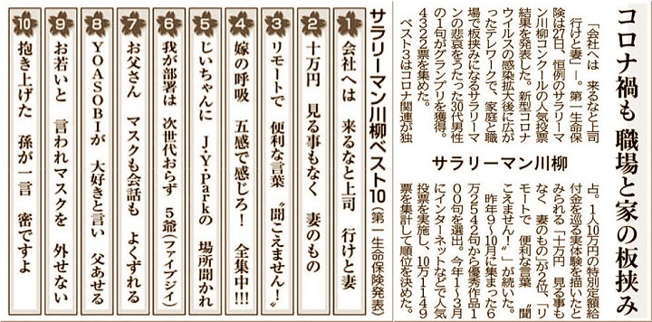 これらの100句の中から、2021年5月下旬にベスト10を発表予定との事でしたけど、本日の中国新聞sanの朝刊に、第一生命サラリーマン川柳ベスト10句が決まった旨の記事掲載が(^.-)☆