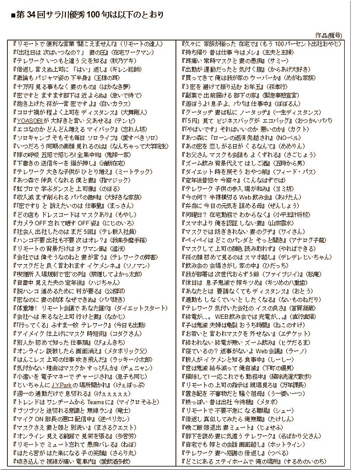 きょう27日(水)から、全国優秀100句の中から第34回サラリーマン川柳コンクールベスト10を決める投票を実施(3月19日投票締切)。2021年5月下旬にベスト10を発表予定。