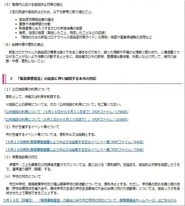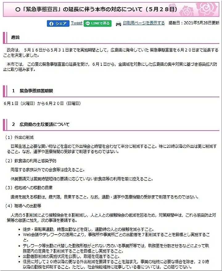 6/20(日)までの緊急事態宣言の延長を受け、本市においても、広島県の集中対策に基づき、感染防止対策に引き続き取り組みます。一丸となってこの難局を乗り越えましょう。
