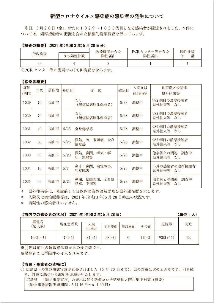 5/28(金)、1029〜1035例目となる7人の感染者が確認されました。詳細は画像のとおりです。