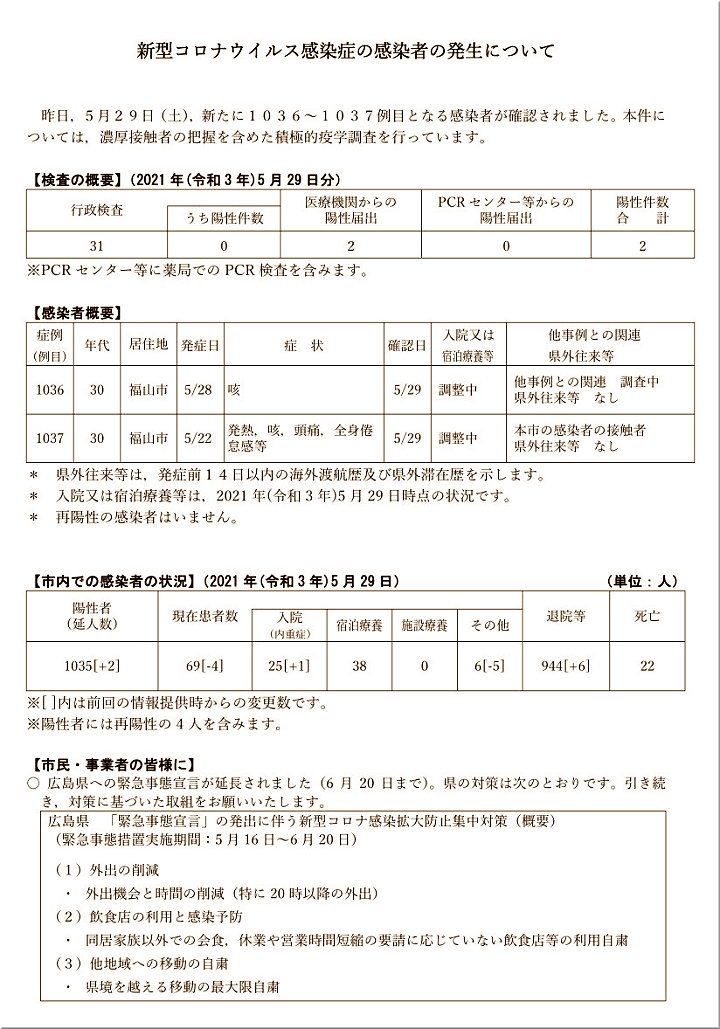 5/29(土)、1036・1037例目となる2人の感染者が確認されました。詳細は画像のとおりです。
