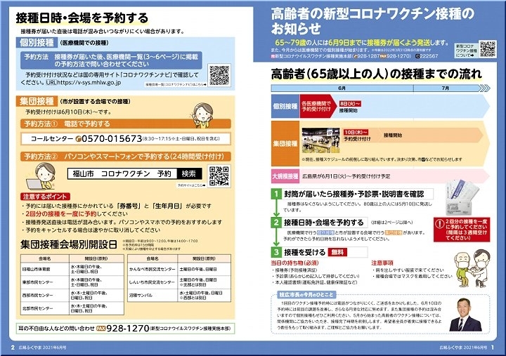 ふ〜ん、福山市の65〜79歳のワクチン集団接種の予約開始は、6/10からですか…