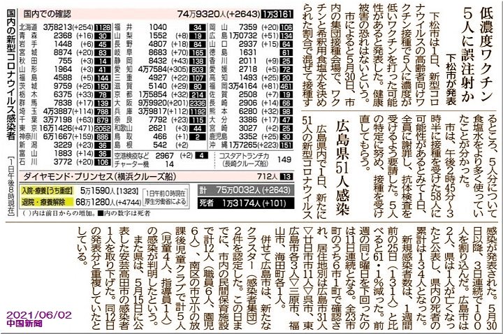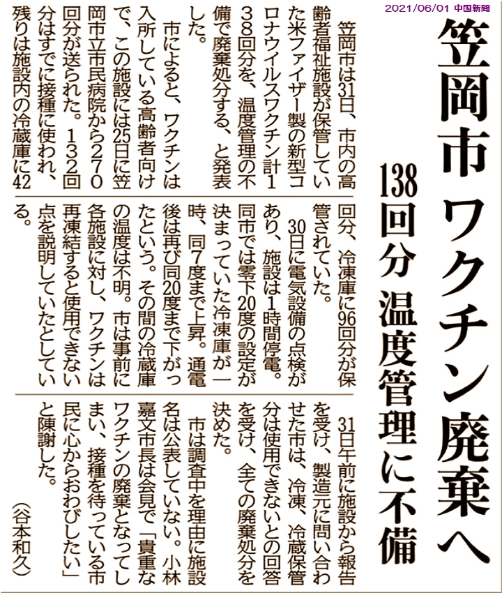 中国新聞sanの朝刊記事から、また、コロナワクチン接種関連の話題を拾ってみました…
