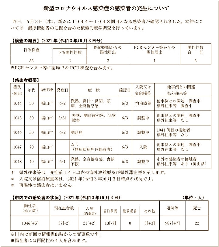6/3(木)、1044〜1048例目となる5人の感染者が確認されました。詳細は画像のとおりです。
