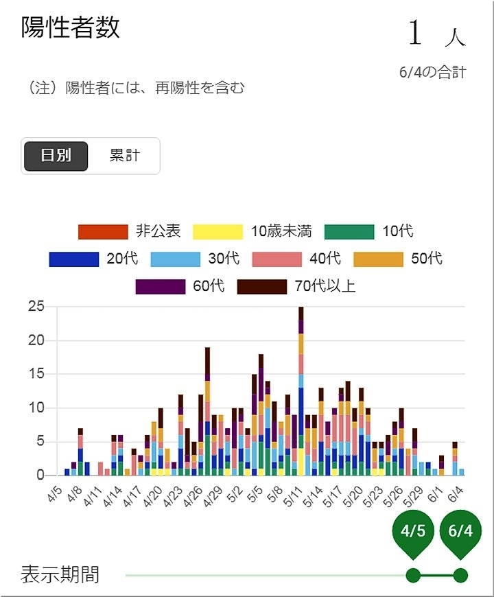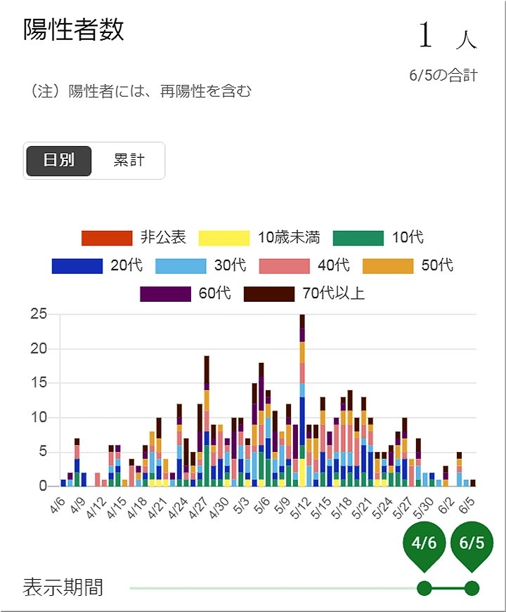 …と、6/3(木)・5人、6/4(金)1人で減少推移にはありますけど、感染者「ゼロ」は続きませんネ(^-^;