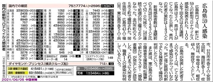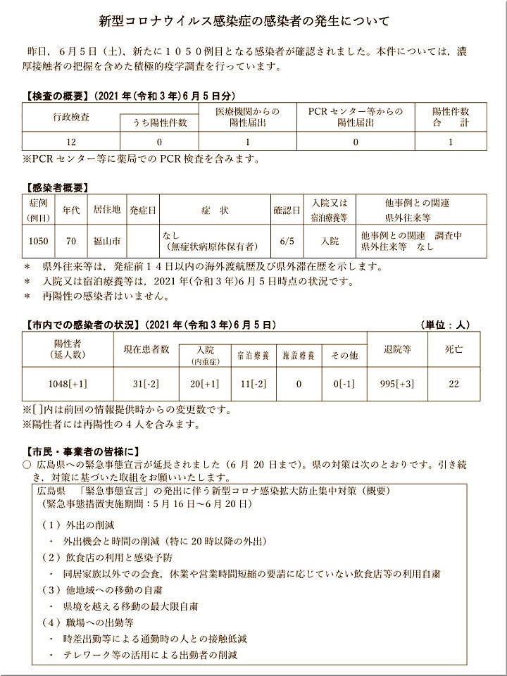本日の福山市の発表によりますと、昨日・6/5(土)は1名のコロナウイルス感染者の発生のようです。