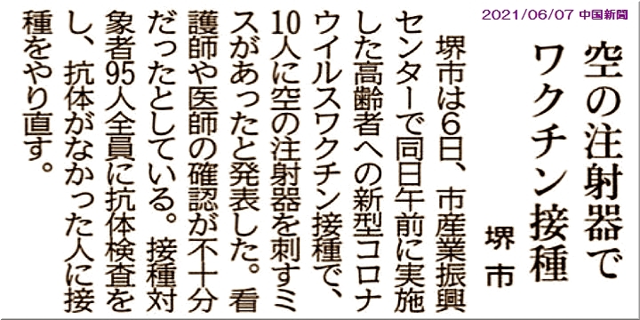 う〜ん、今度は堺市で空の注射器でワクチン接種ですか…