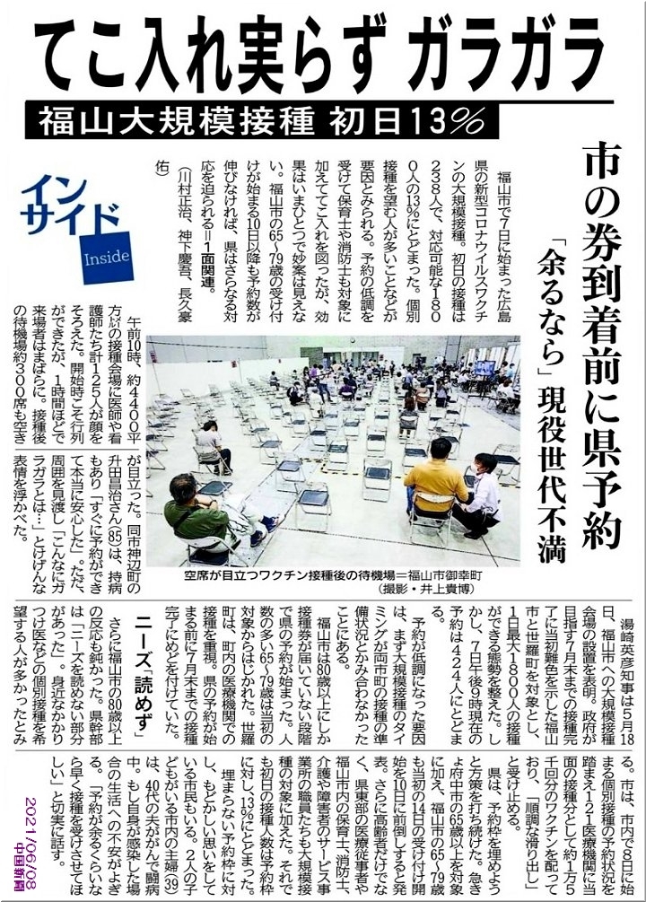 そして、今一つは、福山市で6/6から始まりました広島県の新型コロナウイルスワクチンの大規模接種…初日の接種は238人で、対応可能な1,800人の13%に留まりましたとか。