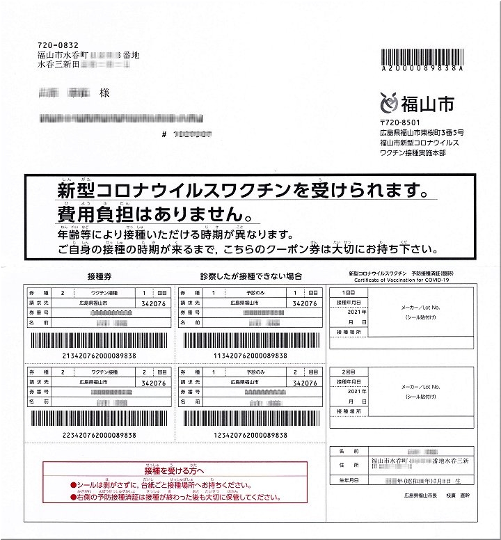 ところで、昨日、福山市よりの「接種券」が郵送で届きまして、集団接種希望のGONsanは、明日・6/10から予約受付開始となります。嫁さんは、近くの掛かり付け医での個別接種ですから、昨日から受付開始かと思いましたら、8月頃からとの事。