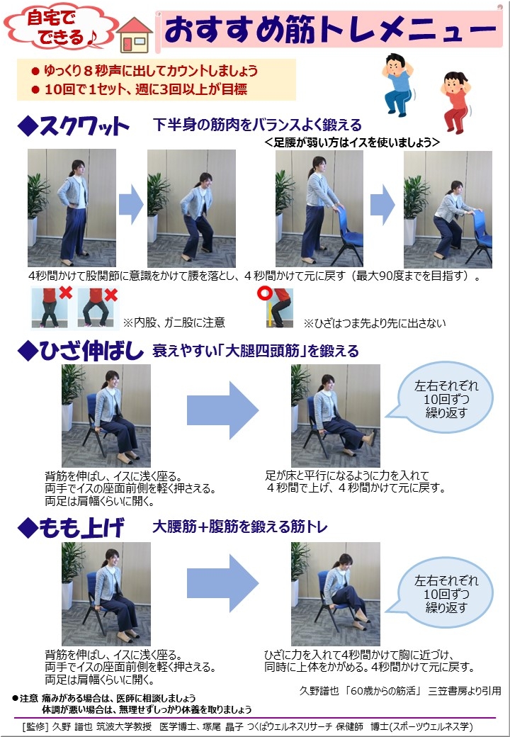 外出自粛により、高齢者がフレイル状態(虚弱)に陥るコロナフレイルが懸念されています。自宅でもできる少しの運動で、体を元気に保ちましょう。