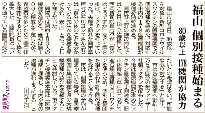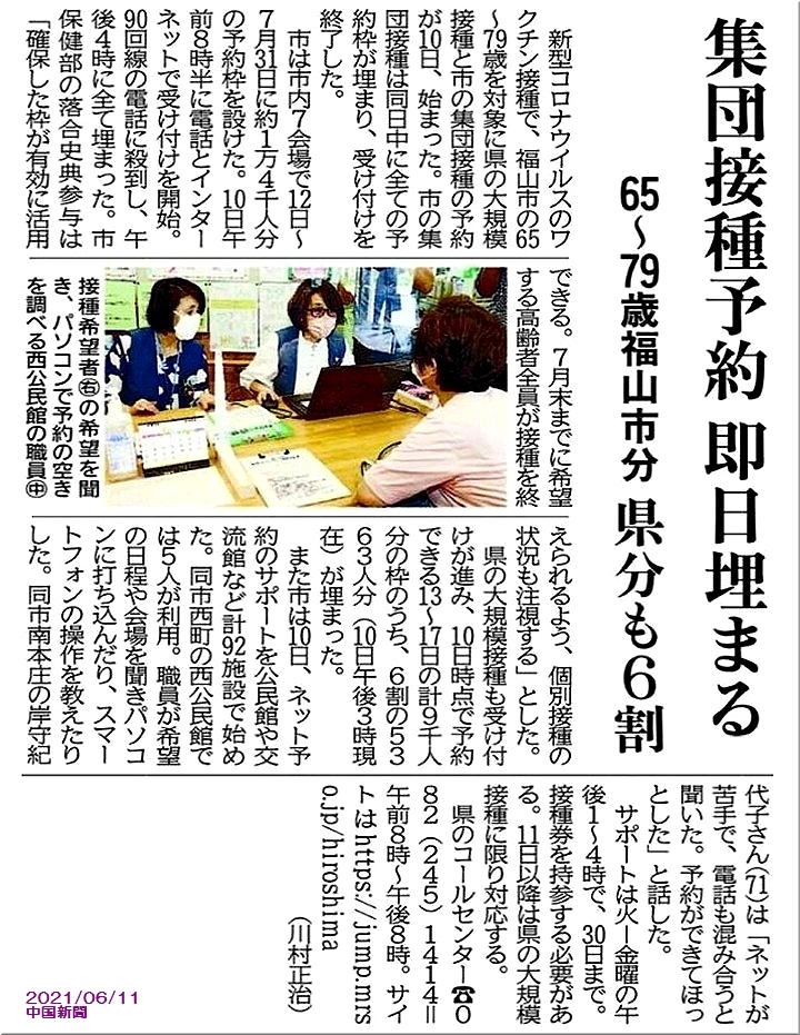 福山市の発表によりますと、福山市のコロナワクチン集団接種予約…予約開始初日の昨日の午後には、早々と、市内7会場の、市の集団接種予約枠14,000人分が凡て埋まりましたとか…