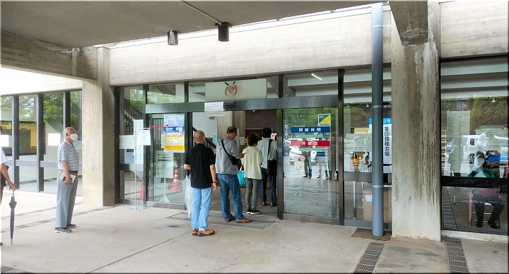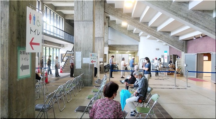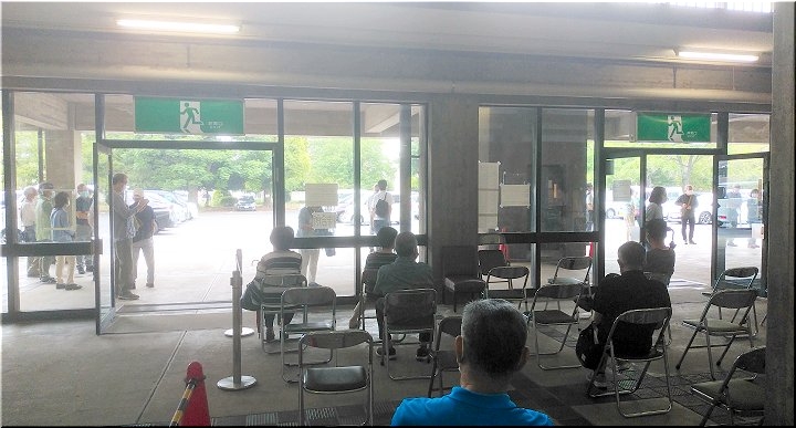 で、少し早めのA.M.10:15に我が家を出まして、旧体育館に到着しますと、10:30予約の皆様が列を作って体育館内にと向かっておられますところでありました。