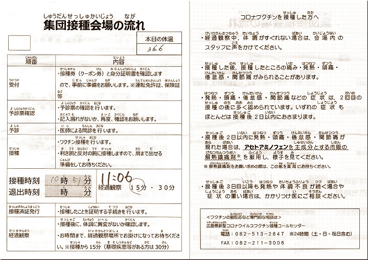 接種時刻が「10:51」で15分間の経過観察ですから、会場から出ましたのは「11:06」でありました。